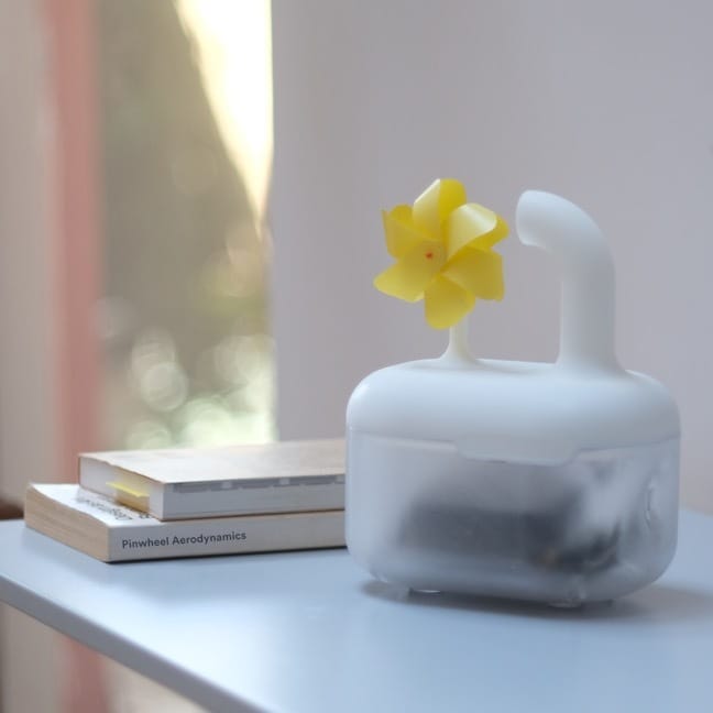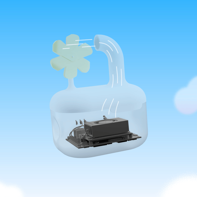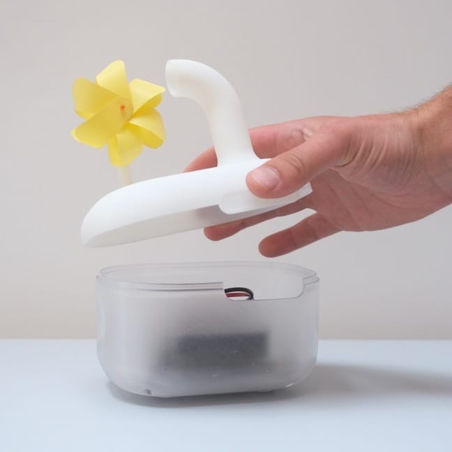 The Hot Air Factory app connects to the AI computer inside the factory, and every time you prompt it it starts thinking. As the computer starts to think, it warms up and the internal cooling fan starts spinning. As the fan pulls cool air from the outside, the warm air is expelled through the top, making the pinwheel spin.